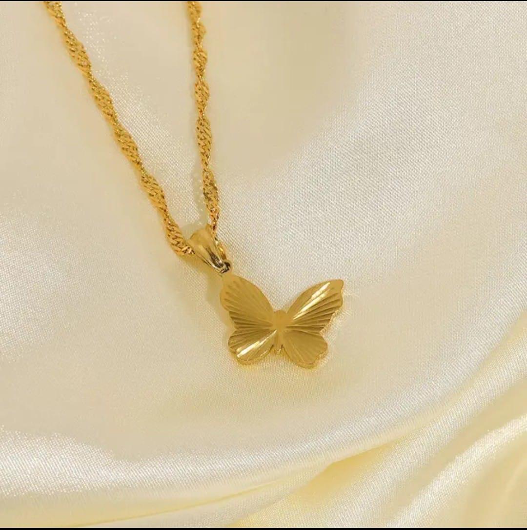 Graceful and minimal, this 18K gold-plated butterfly pendant is a symbol of transformation and lightness. Paired with a twisted rope chain, it adds just the right touch of charm to any look. While not real gold, the anti-tarnish finish ensures long-lasting shine and elegance.