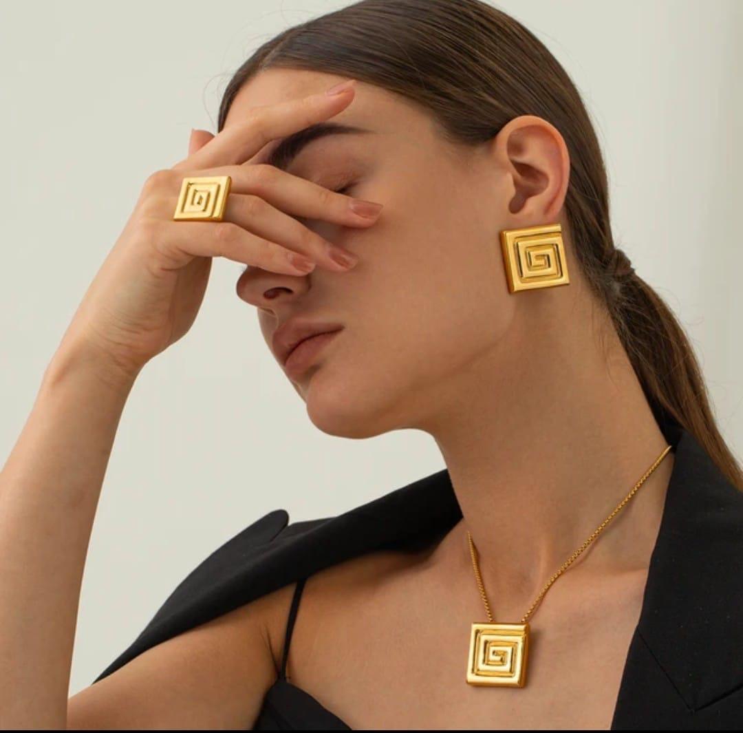 Minimalist with a statement twist—this Greek Maze Jewelry Set includes a sculpted ring, square earrings, and a matching pendant necklace, all finished in luxurious 18K gold plating (not real gold). Designed for the modern muse, this geometric set elevates any outfit with bold architecture and clean lines. Plus, it’s anti-tarnish so you can flaunt it fearlessly.