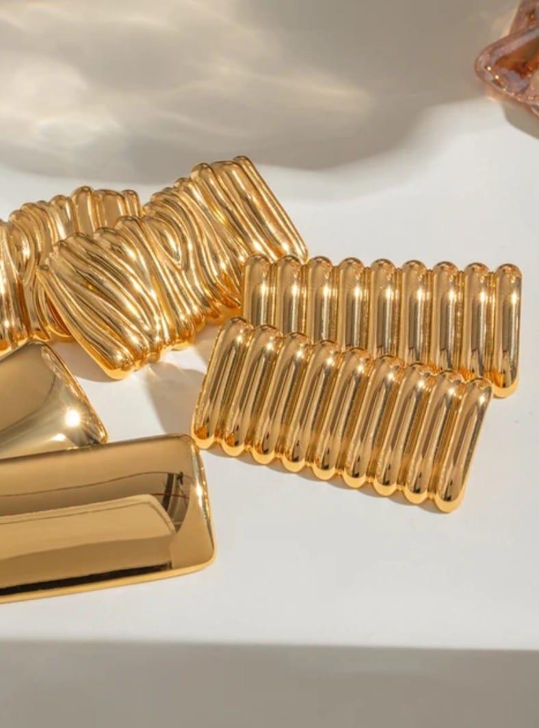 Sleek, sculpted and effortlessly bold, these 18K gold-plated earrings are made for minimalists who love making a statement. The vertical bar design with soft-rounded ridges adds volume without weight, giving a polished edge to both day and evening looks. These are not real gold but come with a premium anti-tarnish coating for lasting shine.