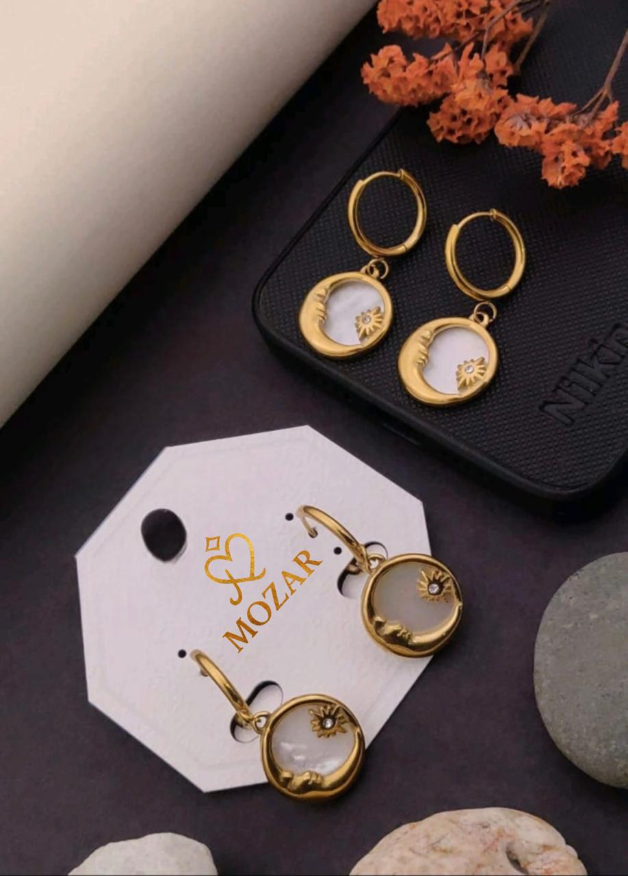 Chase the stars with these celestial-inspired dangle earrings, featuring a moonlit crescent hugging a tiny golden sun over a dreamy white base. Crafted in 18K gold-plated alloy (not real gold), these anti-tarnish earrings are the perfect mix of whimsy and elegance.