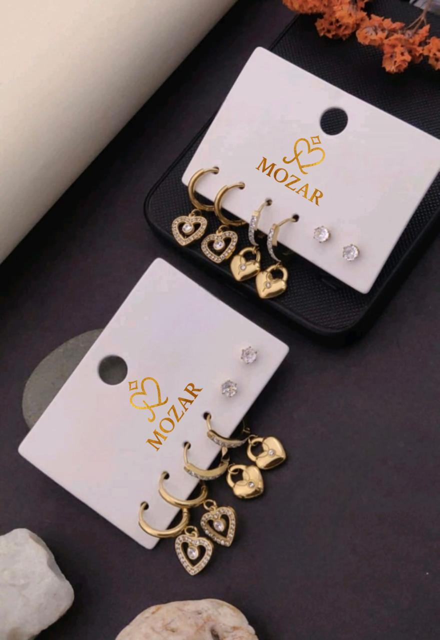 A curated trio for the bold and the elegant. This 3-pair earring set features a dazzling combo of heart-shaped zirconia charms, mini padlock drops, and classic studs. Made with high-quality anti-tarnish material and finished in premium gold plating (not real gold), these earrings are lightweight, stylish, and perfect for mix-and-match styling.