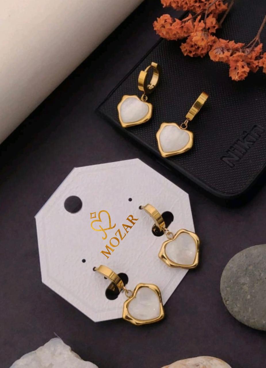 Delicate yet statement-worthy, these heart-shaped white stone drop earrings are framed in 18K gold-plated metal (not real gold) for a soft romantic glow. The anti-tarnish finish keeps the shine fresh, wear after wear.